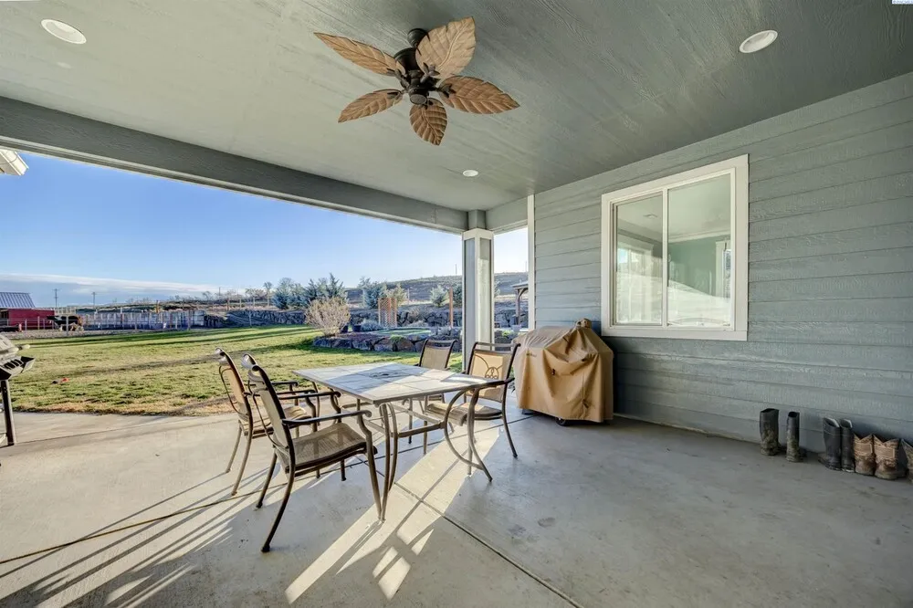 | This exceptional custom-built rambler is perfectly situated on 1.66 acres of outdoor paradise and features a massive 2,000+/- sq ft garage with an RV bay! The home features solar panels that help cover a majority of the property’s electricity needs, offering added efficiency and savings. From the moment you enter, you’re welcomed by gorgeous tile and laminate inlaid flooring that flows through the foyer and into the stunning great room, complete with coffered ceilings, a stacked-stone fireplace with built-ins, and expansive windows and a sliding door that frame the incredible views. Designed for entertaining, the home offers a spacious formal dining room ideal for holiday gatherings, along with a spectacular kitchen showcasing a large island with farmhouse sink, pendant lighting, granite countertops, soft-close cabinetry, stainless steel appliances, a gas range, under-cabinet lighting, continuous backsplash with outlets, and a beautifully appointed walk-in pantry with custom shelving. The thoughtful floor plan also includes a den with French doors, three bedrooms, and 2.5 bathrooms. The luxurious primary suite is a true retreat, featuring private patio access, a wall of custom shelving, a generous custom closet, and a spa-like ensuite with soaking tub, dual vanities, and a massive tiled shower. Step outside to enjoy the peaceful setting with a large covered patio complete with ceiling fan, plus an additional patio area with gazebo, fire pit, and play space—perfect for relaxing or entertaining under the open sky. For those needing ample storage and workspace, the property offers nearly 2000 sq ft of garage space attached with the larger single bay for a car lift or boat. Additional features include a hobby shop with mini-split system & utility sink. Ideal for a hobby farm lifestyle, the property also includes a barn with loft and power, and a fully fenced pasture. All of this is set in a wonderfully quiet and private location, yet just minutes from all the amenities West Richland has to offer. |
