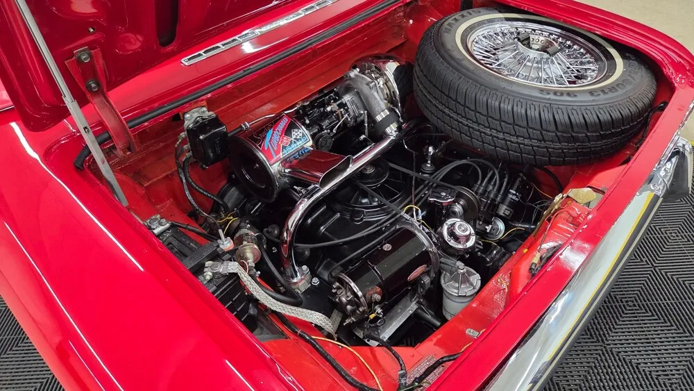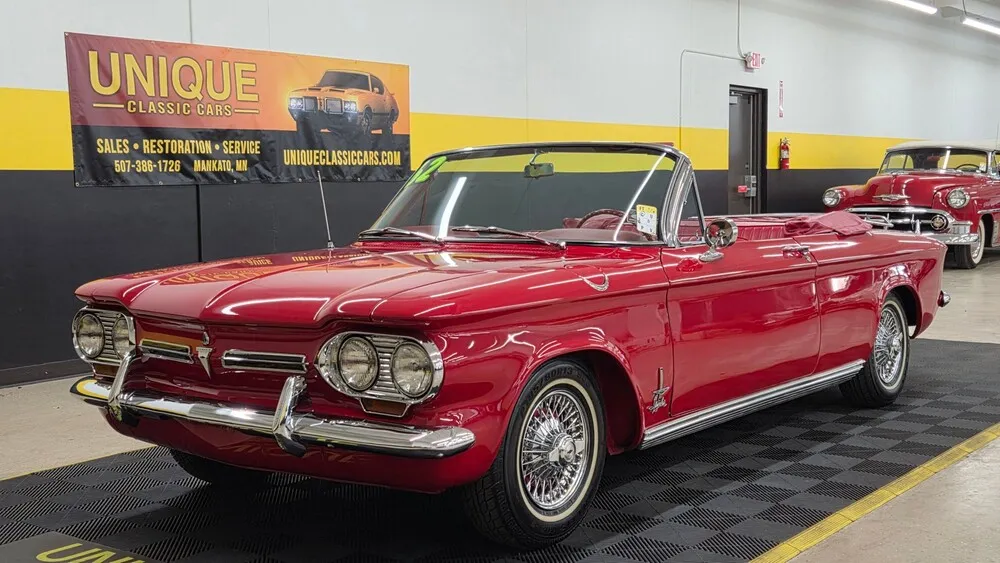 | SOLD, SOLD, SOLD 1962 Chevrolet Corvair Monza Spyder Convertible in Roman Red paint. This restoration, done by Gene Ponder out of Texas, has a Turbocharged 2.4L Flat 6 paired with a 4-speed manual. The turbo, transmission, and engine were all recently rebuilt as of this writing. Outputting 150hp! The first turbocharged American made vehicles were the 1962 Corvair Spyder and the 1962 Oldsmobile F-85 Jetfire; notably BOTH General Motors brands! Riding on wire wheel covers with white wall tires. Red vinyl bucket seat interior (781 trim) with shifter on the floor. Luggage rack in the rear. Chrome and brightwork in great shape throughout. Manual convertible top is white with plastic rear window and fits as it should. Red convertible top cover will be included and in good shape too. Brakes are 80% in the front and 90% in the rear. Bottom ball joints are starting to show wear. Complete exhaust front to rear. Seats and carpeting in great shape! Aftermarket stereo added to the dash. Full size spare located in the engine bay! If this vehicle has repairs you would like to have taken care of that perhaps the seller didn't address, please ask our staff for an estimate. We have a full service and restoration shop that can handle most anything! Please see video for full breakdown of this vehicle. Give us a call at 507-386-1726 or email "sales@uniqueclassiccars.com" to inquire about this vehicle. TRADES WILL BE CONSIDERED AND FINANCING IS AVAILABLE! This particular vehicle IS ELIGIBLE for an extended warranty! Ask us for more details! •••MN residents are responsible for tax, license and title procurement fees. Out of state buyers will only have a $275 Title Procurement fee, no tax or other fees charged.••• |
