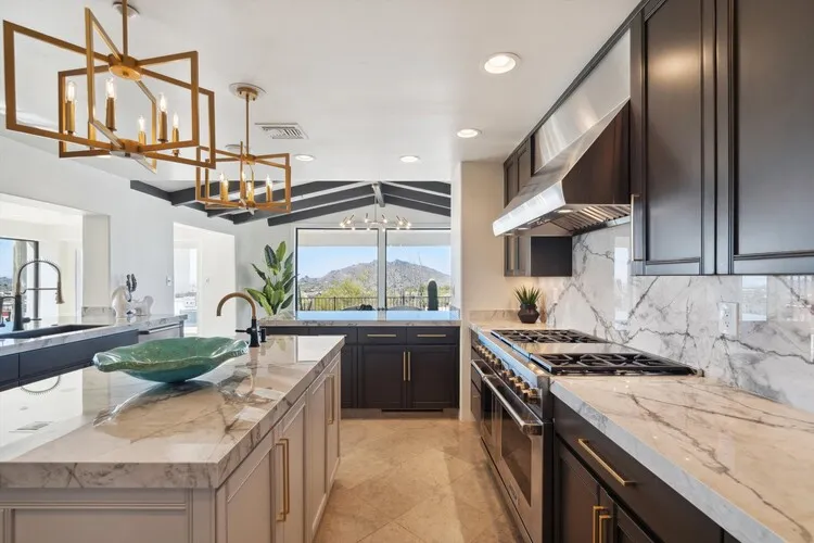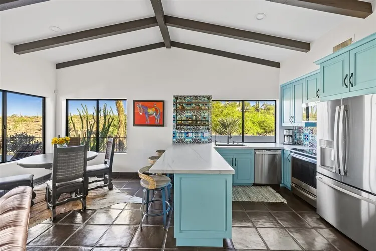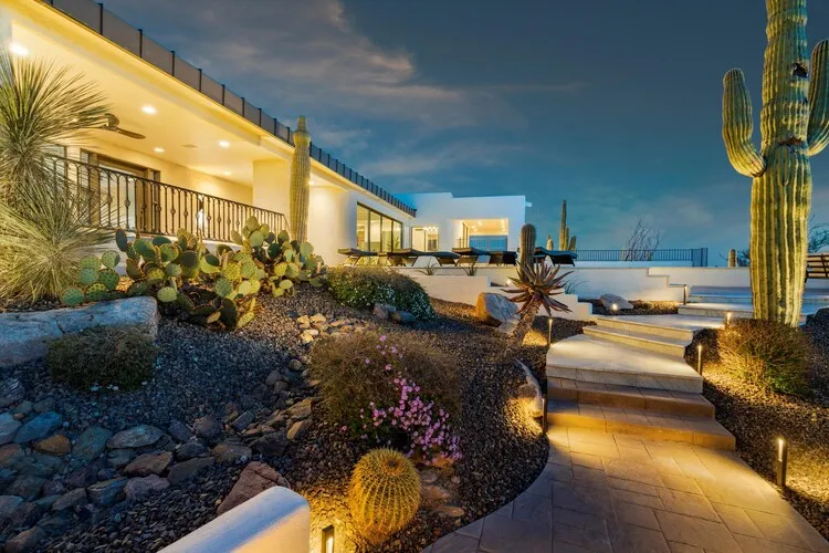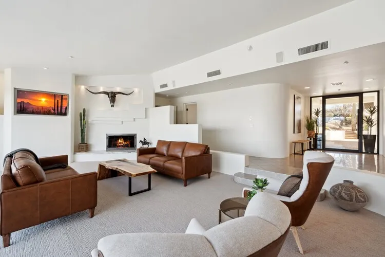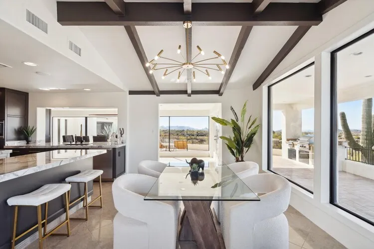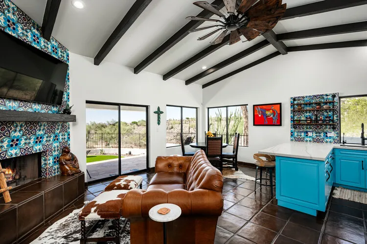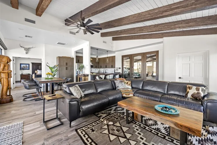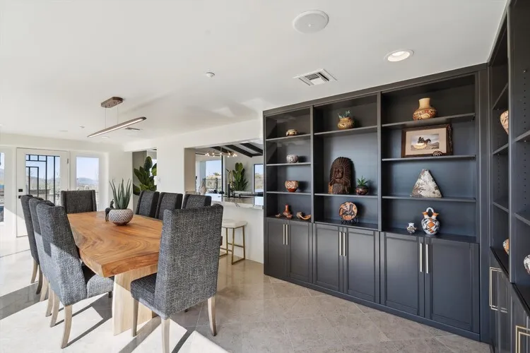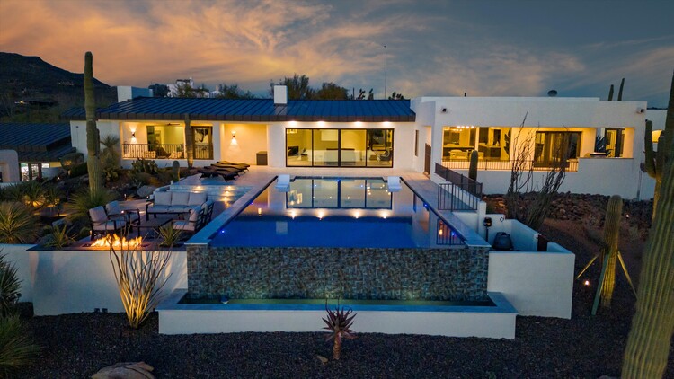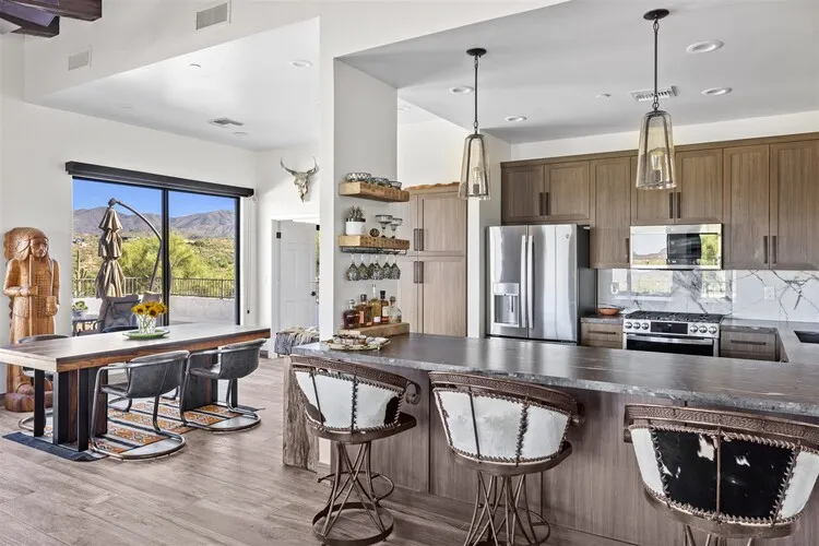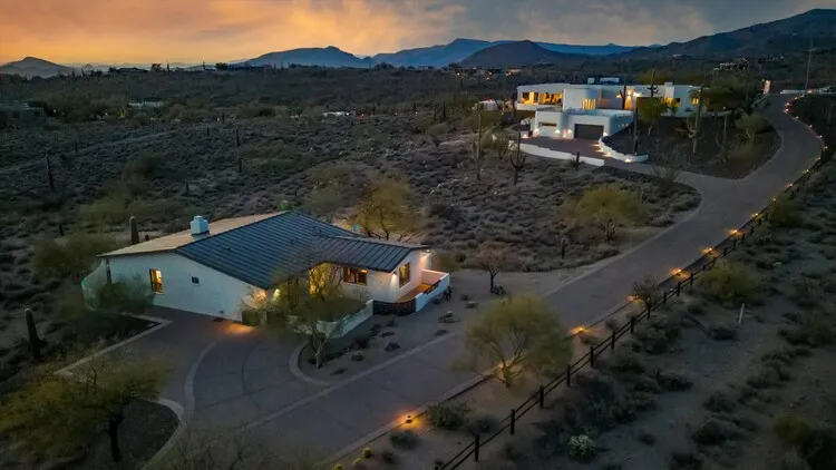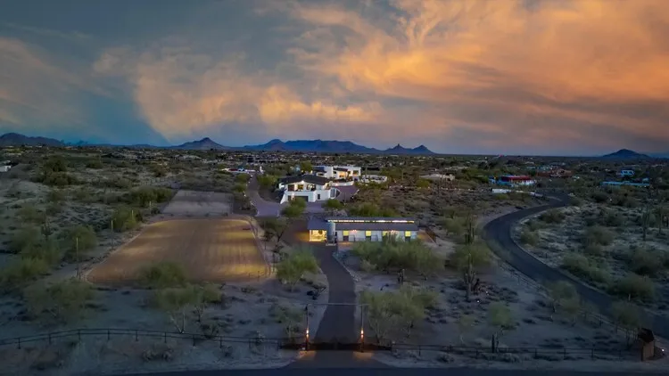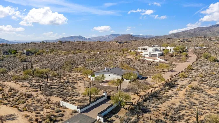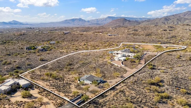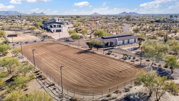 | SOLD ON MAY 28, 2025 for $6,250,000 Double R Ranch, a privately gated compound spanning 10 acres, offers breathtaking sunrises and sunsets with 360° mountain views from its perch overlooking the Sonoran Desert. The newly remodeled home has 8 bedrooms and 8.5 baths, with a 9392 s.f. main residence, 1550 s.f. Southwest inspired guest house and 540 s.f. bunkhouse offering the perfect multi-generational private estate. Constructed with the highest quality materials and well-appointed finishes, this one-of-a-kind property offers a resort-style pool and spa, temperature controlled garages for over 20 vehicles, and full equestrian facilities. At the north end of the ten acres is an M&D barn with 6 stalls and runs, feed and tack rooms, and a wash rack attached to a bunkhouse. Additionally, there is a 200' x 90' lighted arena, and three large turnouts. To store your vehicles in a safe, fully-paved, home environment choose among two traditional garages, a 2700 s.f. pavilion and a 1712 s.f. auto shop with a tool room. Minutes from the eclectic western town of Cave Creek and Scottsdale's upscale attractions, while offering the ultimate in seclusion, Double R Ranch provides car collectors and horse enthusiasts an unparalleled combination of amenities and privacy. |