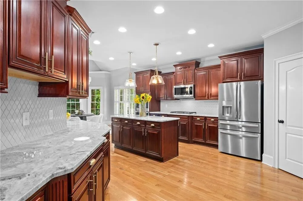 | - Serene 1.6-acre cul-de-sac lot with no HOA and lakefront access. - Updated and remodeled lakefront estate with luxury finishes and a 6-car parking option. - Detached 43x28 garage with 16-foot ceiling ideal for RV, boat, or specialty cars. - Saltwater resort-style pool, entertaining bar, and half basketball court on premises. - Primary suite on main with fireside sitting room, custom closet, spa-like bath. - Finished basement with second kitchen, large family room, billiards, and panic room. - Five bedrooms including main-level master and a teen suite upstairs in a flexible layout. Nestled on a serene 1.6-acre cul-de-sac lot with NO HOA, this beautifully updated and remodeled lakefront estate offers unparalleled luxury and privacy. Park over 6 cars with the attached 3 car garage plus the custom detached specialty garage. Detached garage measures 43x28 with a 16' ceiling and is perfect for your RV, boat, or specialty car collection! Fully stocked lake with platform dock just steps from your patio! A stunning resort-style saltwater pool with an entertaining bar and half basketball court completes this outdoor paradise! Heading inside, this expansive master-on-the-main floorplan features five bedrooms, including a luxurious primary suite on the main level with a fireside sitting room, custom closet and beautifully updated spa-like bathroom, two additional main level bedrooms, two laundry rooms, a potential in-law suite in the finished basement and a unique teen suite upstairs, providing ample space for family and guests. Aside from the recently renovated master bathroom, the kitchen has also been updated and boasts both beauty and functionality as it flows seamlessly to the two story great room and sunroom! Descending below, the finished basement is an entertainer's dream and a perfect floorplan for a potential in-law's suite featuring a secondary kitchen plus a spacious family room, panic room, second laundry room, home office, billiards room and additional potential bedroom opportunities! Excellent location- just minutes from Milton and Alpharetta! Zoned for award winning Creekview HS district! |