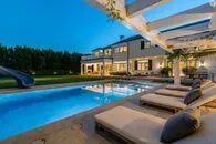 | SOLD for $28,500,000 in Sept. 2022 Laden with luxe amenities and incredible design. 1172 Napoli Drive is a gated oasis located next to the prestigious Riviera Country Club. With seven bedrooms, nine bathrooms and an impressive 13,452 square foot floorplan on over a half-acre, this home beckons a coveted lifestyle of beauty and comfort. Immediately making an impression with a grand façade and lush front yard, the home features a columned front porch, a three-car garage and a motor court. Inside, ceilings soar overhead and a curved staircase greets guests in the foyer. Find a lovely sitting room with box beamed ceilings and bay windows, a formal dining room with a statement chandelier and an enticing family room with a fireplace and a wall of glass that opens to the tranquil outdoor space. Dine al fresco under the covered patio (complete with heaters, a fireplace and a flat screen), cook a delicious meal in the outdoor kitchen, lounge poolside, soak in the spa or have a splash of fun with the waterslide. Enjoy an expansive lawn, raised garden beds, a gorgeous guesthouse with a kitchenette and bathroom and the privacy created by surrounding fiscus trees. The kitchen provides chic blue cabinetry, Miele appliances, marble countertops, a dining area and a long window seat that looks out onto the garden. A butler’s pantry adds ease and a secondary family room features gorgeous wallpaper. A perfect work-from-home retreat, the stylish office includes a wall of built-ins and elegant wainscoting. The magnificent primary suite features vaulted ceilings, a fireplace, a spa-like bathroom, an exquisite walk-in closet and a balcony. Additionally, find a wellness room, upstairs lounge, laundry room with four machines, spectacular theater, lower level rec room with a full bar, a temperature-controlled, walk-in wine cellar and a gym. With every detail carefully attended to, experience the height of style and luxury. Your private haven awaits. |