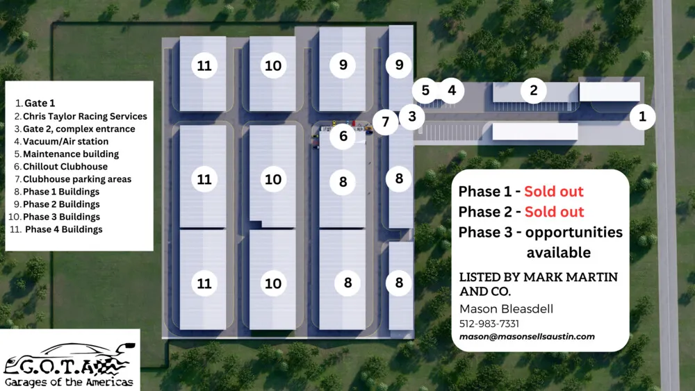 | The Garages of the Americas is an exclusive garage condo, Autominium, community for automotive enthusiasts, located right across from the iconic Circuit of the Americas™ racetrack in Austin, Texas. Whether you're looking for a space to store your cars, RV’s, trailers, boats, prepare for track days, or enjoy the camaraderie with like-minded enthusiasts, this is the place for you. THE LOCATION Directly across the street from Circuit of the Americas™ property, this 17 acre community of garage condos is for all your luxury car storage needs, track day storage, car preparation, and the member only CHILLOUT Systems™ clubhouse. Hang out with like minded car enthusiasts, and be right across the street from iconic Circuit of the Americas™ racetrack, 24 miles to Harris Hill Raceway, and 2.5 miles from the Austin Airport. THE PLAN Our state-of-the-art community offers up to 200 units, ranging from 1,650 to 2,250 square feet, with options to combine, as many buyers have, and customize spaces for up to 45,000 square feet. This complex was designed by racers and enthusiasts, as well as experience from visiting nearly all similar developments throughout the country to learn from and create a peerless complex in Austin, Texas. The complex also has an on-site vehicle repair, transport, prep, maintenance shop and on-site store for racing gear. There is also an on-site detailing and PPF shop as well. Compare the dimensions, pricing, value and what is standard (included) in our units and complex and you will see it is unrivaled by anyone. UNITS No detail has been overlooked in our units, our 2nd floor mezzanines range from 625 square feet to 750 square feet, have a 14 foot clear height, integrated into the spine of the building to not need structural supports taking up floorspace, lowest point of the ceiling on the Mezzanine is 9’ all the way up to 12’6”, commercial grade full thermal, low E soft coated windows, drywalled 4 walls, full lighting, AC/Heat rated up to 60,000 BTU, industrial staircase with cable railing and commercial grade TREX flooring on mezzo., 100 amps of 3-phase power, gigabit internet, and a HD TV package, ensuring you have everything you need to enjoy right away. CHILLOUT SYSTEMS CLUBHOUSE The CHILLOUT Systems™ clubhouse is truly the crown jewel of the GOTA project! Spanning an impressive 10,000 square feet and our partnership with Rafa Racing Club, this space is unlike anything you've seen for a project like this. Including a bar and BBQ area, a second-story balcony, not one, but two meet-and-eat areas, classrooms, a glass wall conference room, lounge areas throughout, TVs everywhere, a driving simulator room, and the glass hanger doors to put it all over the top and allow us to even put a car in the double height main entry for events. Beyond that, down to the most thoughtful details like jump office spaces, a member locker area, laundry facilities, and restrooms with showers, nothing has been overlooked. Our member clubhouse will also have a full time concierge attendant to bring unequaled, on site concierge services for our owners. Garages of the Americas is not just a place to store your cars and toys; it's a lifestyle community built by enthusiasts, for enthusiasts. Phase 1 and 2 are completely sold out in pre-sale stage, and Phase 3 is selling now. If you want in, now is your chance.  |