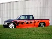 | 1996 Dodge Ram Ext Cab Short Bed Hot Rod This truck “Talks the Talk, and Walks the Walk”. Let’s start with mile deep paint as seen in the license plate reflection. The House of Color Tangerine tribal flames flow into the door jams, gas tank door, etc. Flush steel tonneau, rolled pan, Reflection’s cowel induction steel hood, all handles are shaved, 2001 sport bumper, billet grills, and a hidden license plate that pops up out of the bed rail behind the cab. Pro Charger inter cooled super charger, hooked to a 4 spd auto, and 355 gears. 3” exhaust, Magna Flow mufflers, 20” Boyd wheels, cross drilled rotors, and rear discs. Katzkin leather interior, Play Station 2, video screens in sun visors, Sony MP3 with Boston acoustic speakers, Billet Specialty pedals, custom gage pods, and a wild Air Ride Technologies system with bags and shock waves, that are fully remote with four corner display in the console. Twin 5 gal ceramic tanks, 2 Viair 400 compressors, ½” line, Big Red valves, and C-notched frame enables this truck to go from plowing dirt to ride height in the blink of an eye. Pampered show truck with top awards in Canada and the US. Just started a new project, need the money. US funds. |