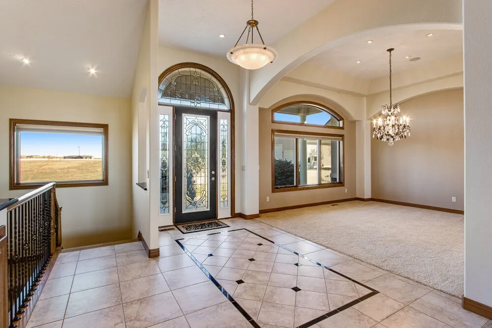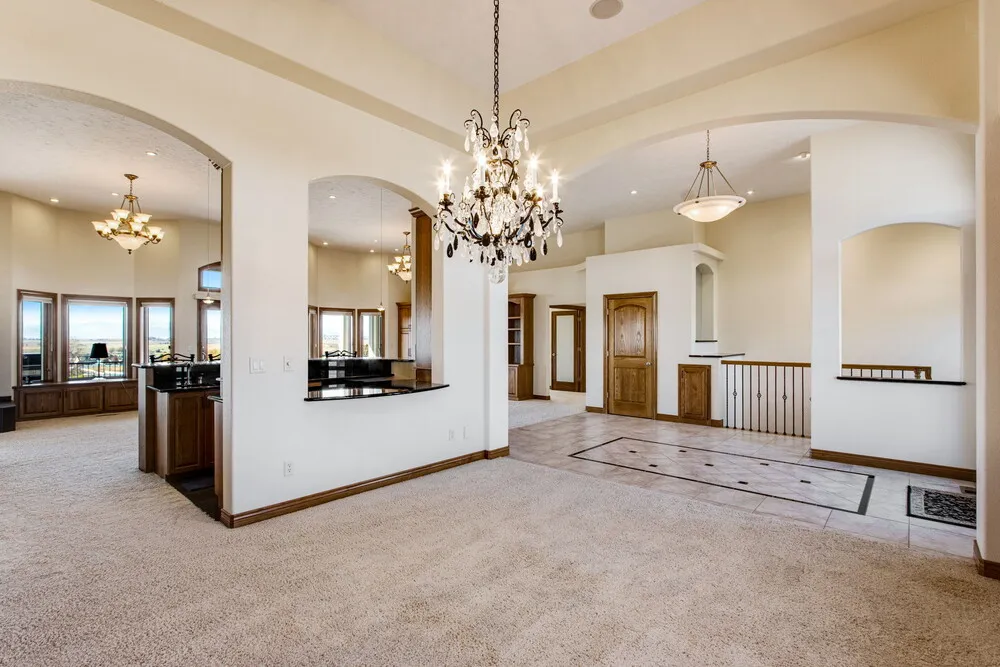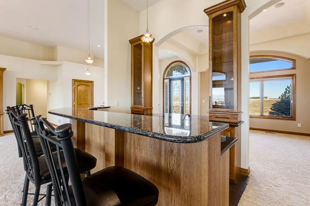 | This incredible estate showcases some of the most breathtaking Rocky Mountain views you will ever experience and offers an unmatched combination of luxury living, expansive space, and top-tier amenities. Featuring a total of 3,751 square feet of heated and impeccably maintained garage space, this property is built for those who value storage, hobby areas, and room for every vehicle and toy. The attached, fully finished, heated 4-car garage provides 1,440 sq. ft., while the primary detached and heated RV/garage building offers 1,208 sq. ft. with two overhead doors for easy access. A second detached 1,103 sq. ft. garage adds even more room for toys, equipment, or workshop needs. The sprawling ranch-style primary residence delivers something for everyone with 3,431 sq. ft. on the main level, including an elevator, formal dining room, office or 5th bedroom, greeting bar, front office or optional fifth bedroom, family room, and a luxurious primary suite with retreat space, a 5-piece spa bath, walk-in closet, and a second laundry. The open kitchen includes a center island, corner pantry, and abundant cabinetry and counter space. A guest bedroom sits near a 3/4 bath, plus there is a guest half bath and a large laundry area with freezer, washer, and dryer included. The walkout basement features 3,366 square feet, 9' ceilings, a dedicated theater, wet bar/kitchenette, billiard area, two additional spacious bedrooms, and two baths. Nestled on 4.65 acres, the exterior offers patios on all sides, mature landscaping with sprinkler and drip systems, two water features, and unobstructed views in every direction. Additional highlights include a high-efficiency furnace, two water heaters, central air, and a whole-home generator. |