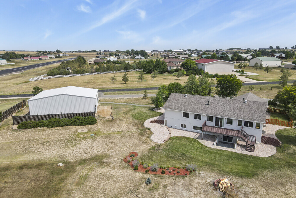 | Bring all your toys and enjoy life! This lovely home with a 2050 sq ft hangar is located on over two acres at Colorado's premier private airpark and has been almost completely renovated over the last two years. New features: practically maintenance free exterior stucco, hail resistant roof, gorgeous wood flooring on the entire main level, carpet in basement, beautiful bathrooms, windows, front door, interior doors, fresh paint, on demand water heater, concrete in garage and hangar, evaporative cooler. Light and bright, the living room, with its vaulted ceiling and fireplace, is perfect for entertaining. The Front Range is highlighted through an abundance of windows and from the West facing deck. The large kitchen offers granite counters and a moveable island. Relax in the large primary bedroom with en suite bath, walk-in closet, and those mountain views. Two secondary bedrooms, a full bath, a half bath, and laundry nook are also on the main floor. The garden level basement features West views, a wet bar, more bedrooms, a full bath, the utility room, and a storage closet. The mature landscaping boasts trees, shrubs, grass, automatic watering, a flagstone patio in front, and an RV parking spot with 50Amp power. The attached garage is oversized at 528 sq ft. This home is located right on the runway, so you can watch air traffic, and has direct taxiway access. With a 2050 sq ft hangar, you have great storage for aircraft, vehicles and other toys. The hangar is heated and fully insulated, has electricity and gas, and doors that open to 10 feet. Parkland Estates (7CO0) offers two runways, with pilot operated lighting on the 4200' East/West runway. Also, VASI, a segmented circle with windsock, and a fuel farm. Erie is a fast growing community with a charming downtown and offers many community activities. Just two miles West of I-25, it's less than 30 minutes to Boulder and about 40 minutes to downtown Denver. | |